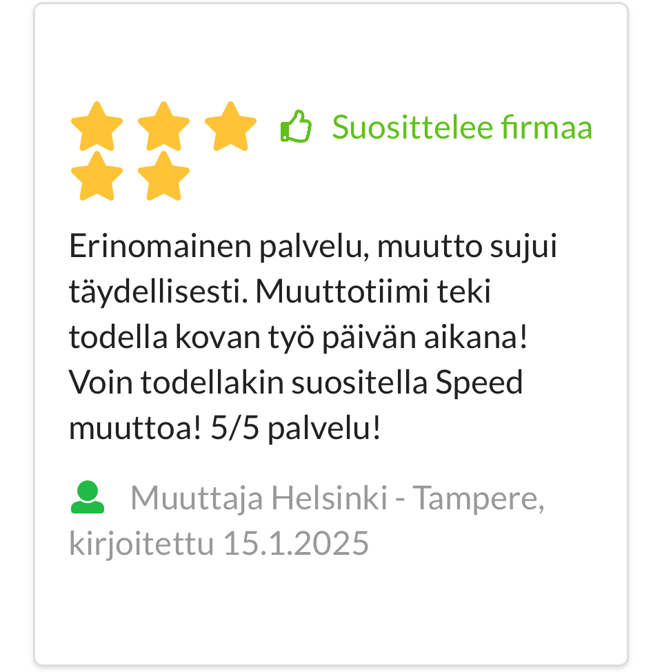 Palvelemme innokkaasti niin pieniä kuin suuria kotimuuttajia sekä erilaisia kestävyyttä vaativia yrityskokonaisuuksia. Otamme haastatteluin huomioon erityistarpeet muutoissa ja asiakkaissa itsessään. Joustavuudellamme ja tavoitettavuudellamme kaikki asiakkaat tulevat kuulluiksi ja nähdyiksi. Tämän seurauksena olemme saaneet Muuttomaailmassa, joka on Suomen johtava muuttokilpailutus-verkkopalvelu, satoja ja taas satoja viiden tähden arvosteluja. Facebookissa Speed Muutto ja Kuljetus Oy-sivujemme arvostelujen keskiarvo on 5.